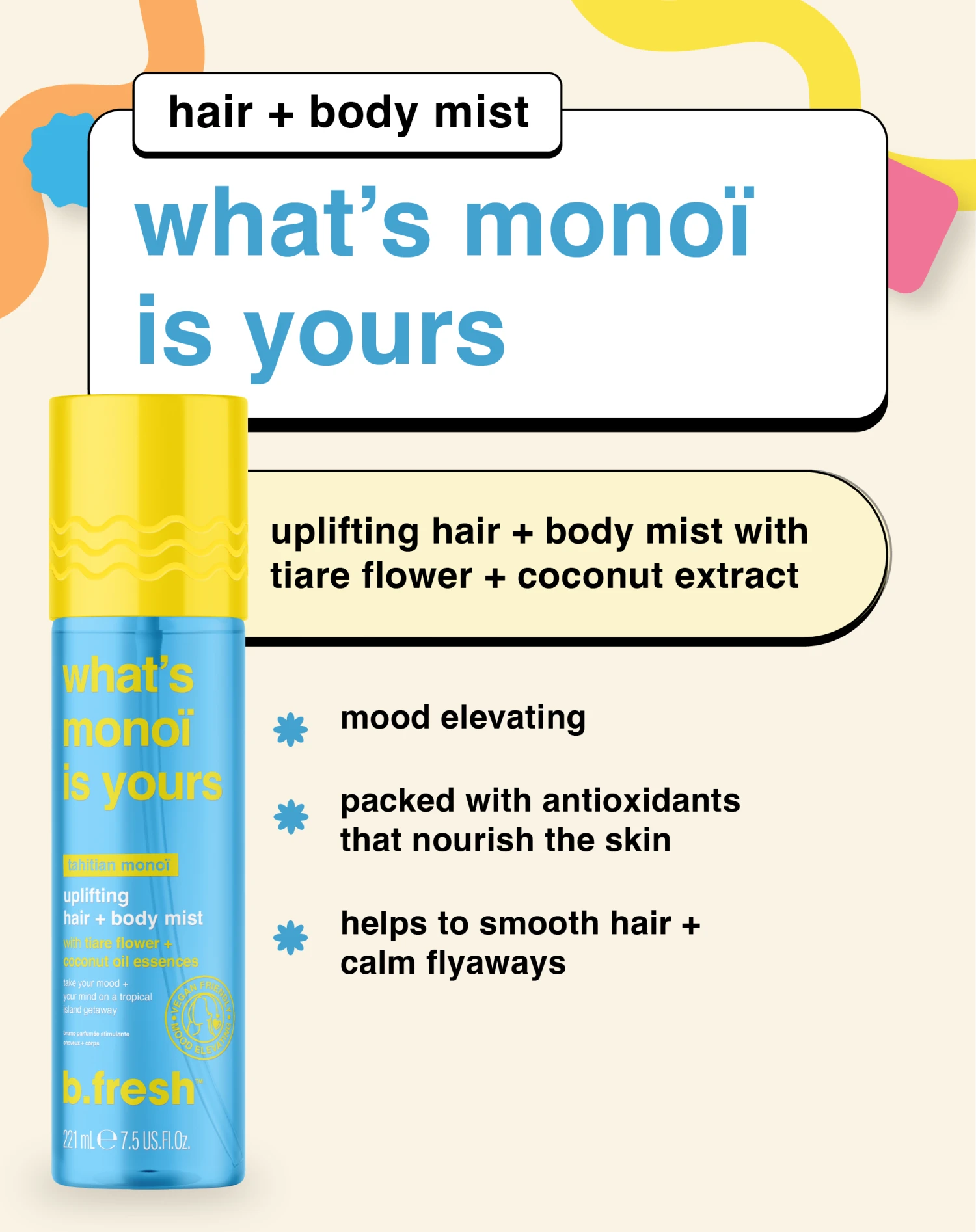an uplifting hair + body mist with tiare flower + coconut extract to bring you straight to the beaches of tahiti.